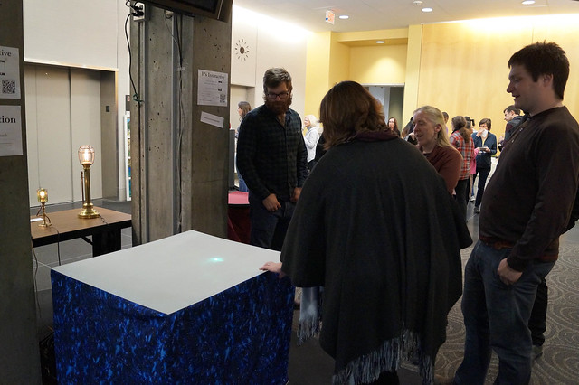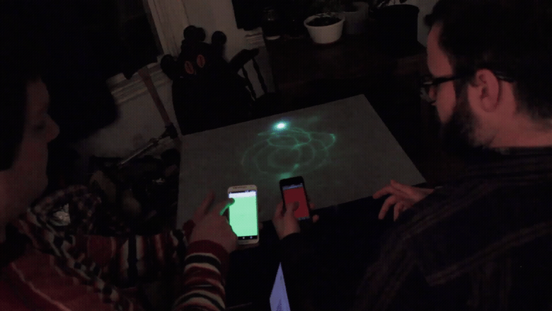 We fixed the UV laser to point at a piece of mirror that has been hot glued to two Arduino-controlled servos which have also been hot glued together. Everything was then mounted to some scrap 2 x 4 wood. We built a short table out of scrap wood which we wrapped with some space-themed cloth. The table’s surface was a big piece of acrylic which we coated with the contents of several cans of glow-in-the-dark spray paint. A web server was made with Node.js which collected finger positions on phone screens, sent them through a serial port to the arduino, which translated them into servo angles and adjusted the mirror to the updated position.